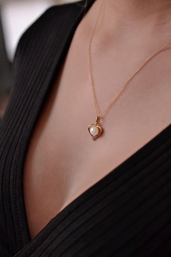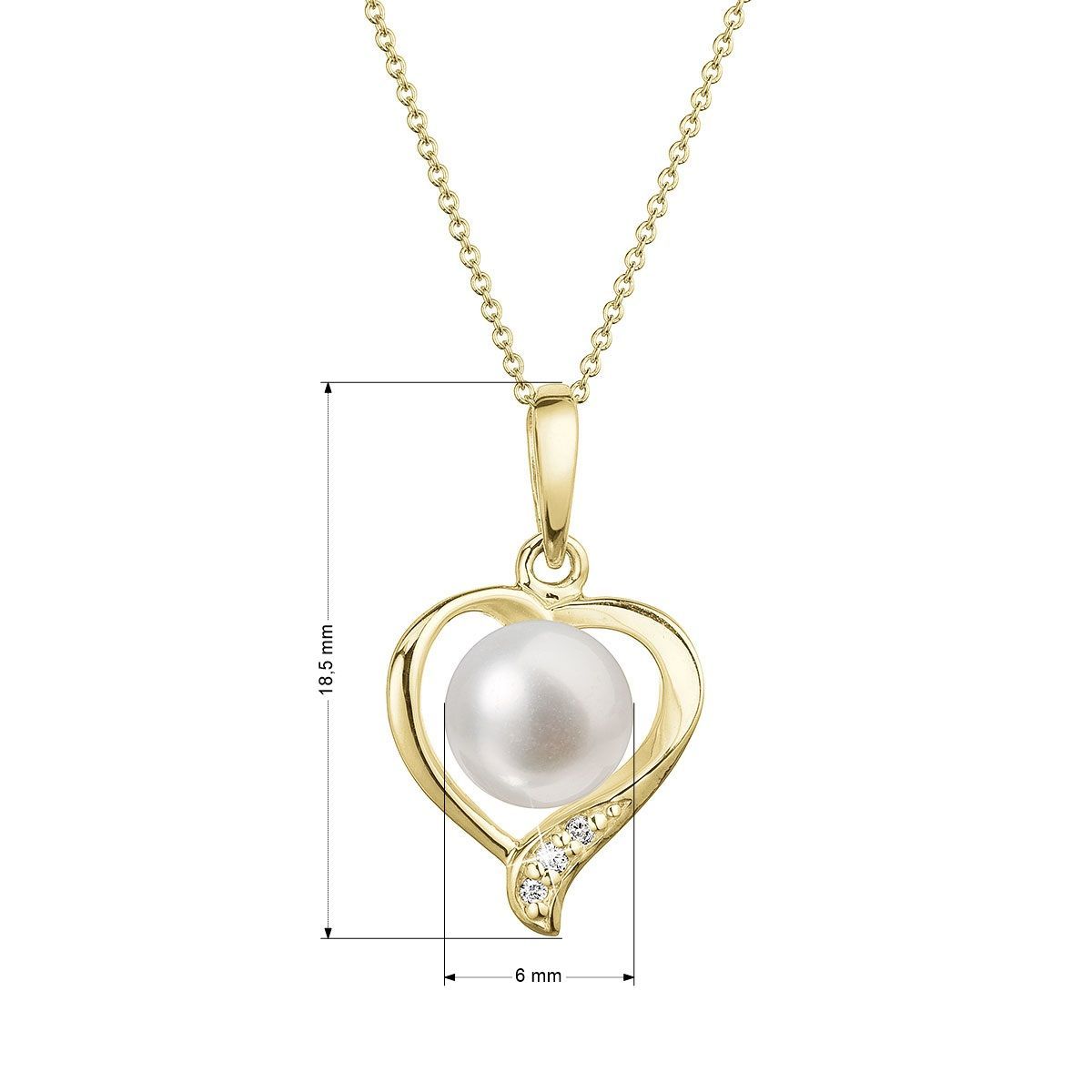 Na náhrdelník bylo použito 14 karátové žluté zlato s ryzostí 585/1000 a pravá kultivovaná sladkovodní říční perla s brilianty. Perla o průměru 6 mm je vysoké kvality AAA. Tvar zlatého srdíčka je zdobený třemi nestárnoucími brilianty o 0,015 ct., v barvě G a čistotě SI1.